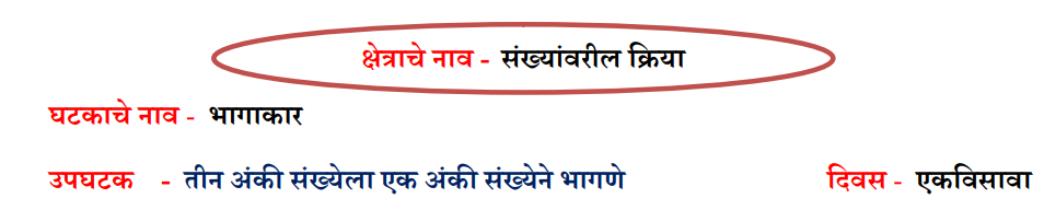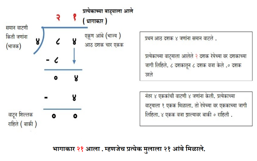 उदा : वाऱ्यामुळे बागेत पडलेले ८४ आंबे वेचून ४ मुलांनी आपापसात समान वाटले तर प्रत्येक मुलाला किती आंबे मिळाले ?